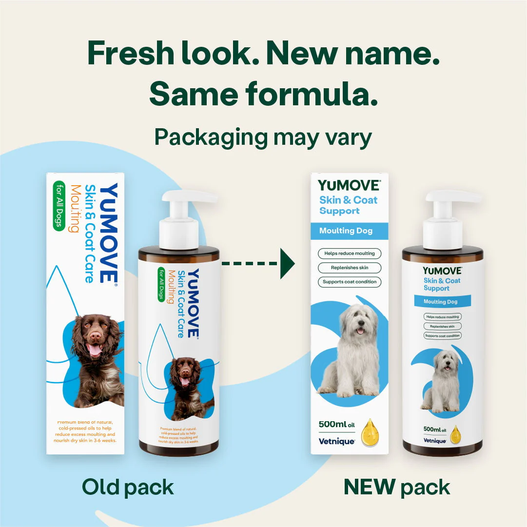YuMOVE Moulting Dog, previously YuDERM Dog, is a premium quality coat and skin supplement that’s full of natural essential Omega 3 and 6 oils for your dog's coat. YuMOVE Skin & Coat Care Moulting Dog's premium cold-pressed Golden Flax and Starflower (Borage) oils help reduce dog moulting and support healthy skin. It helps to boost coat growth and condition to reduce moulting.